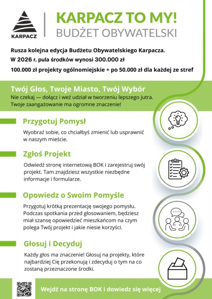 Właśnie rusza kolejna, tym razem jubileuszowa edycja Budżetu Obywatelskiego Karpacza :) To już 12 lat wspólnego kształtowania lokalnej przestrzeni, realizowania marzeń i tworzenia miejsc potrzebnych mieszkańcom. Pragniemy, aby ten rok był wyjątkowy - pełen inspiracji i jeszcze większego zaangażowania! Nie czekaj — dołącz i weź udział w tworzeniu lepszego jutra dla nas wszystkich. Twoje zaangażowanie ma ogromne znaczenie!